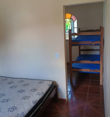 São 6 quartos confortáveis, todos com cama de casal e solteiro, incluindo 1 suíte com varanda e vista para o lago.